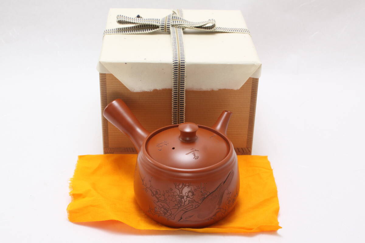 - 1077 新品未使用品 傑作 合作 彫 初代 水上暁山 造 昭邨 (初代) 梅潤入書 緻密細字彫 朱泥 210g 茶注 急須 煎茶道具 布 木箱