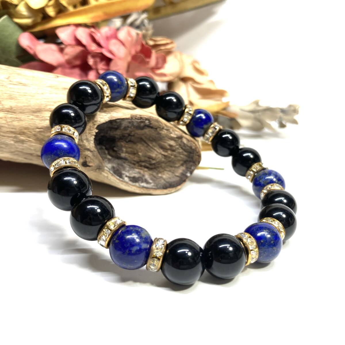 > モリオン&ラピスラズリ パワーストーン ブレスレット 天然石ブレス (ゴールド) 10mm メンズ・レディース 厄除け 幸運 仕事運 学業運 ☆