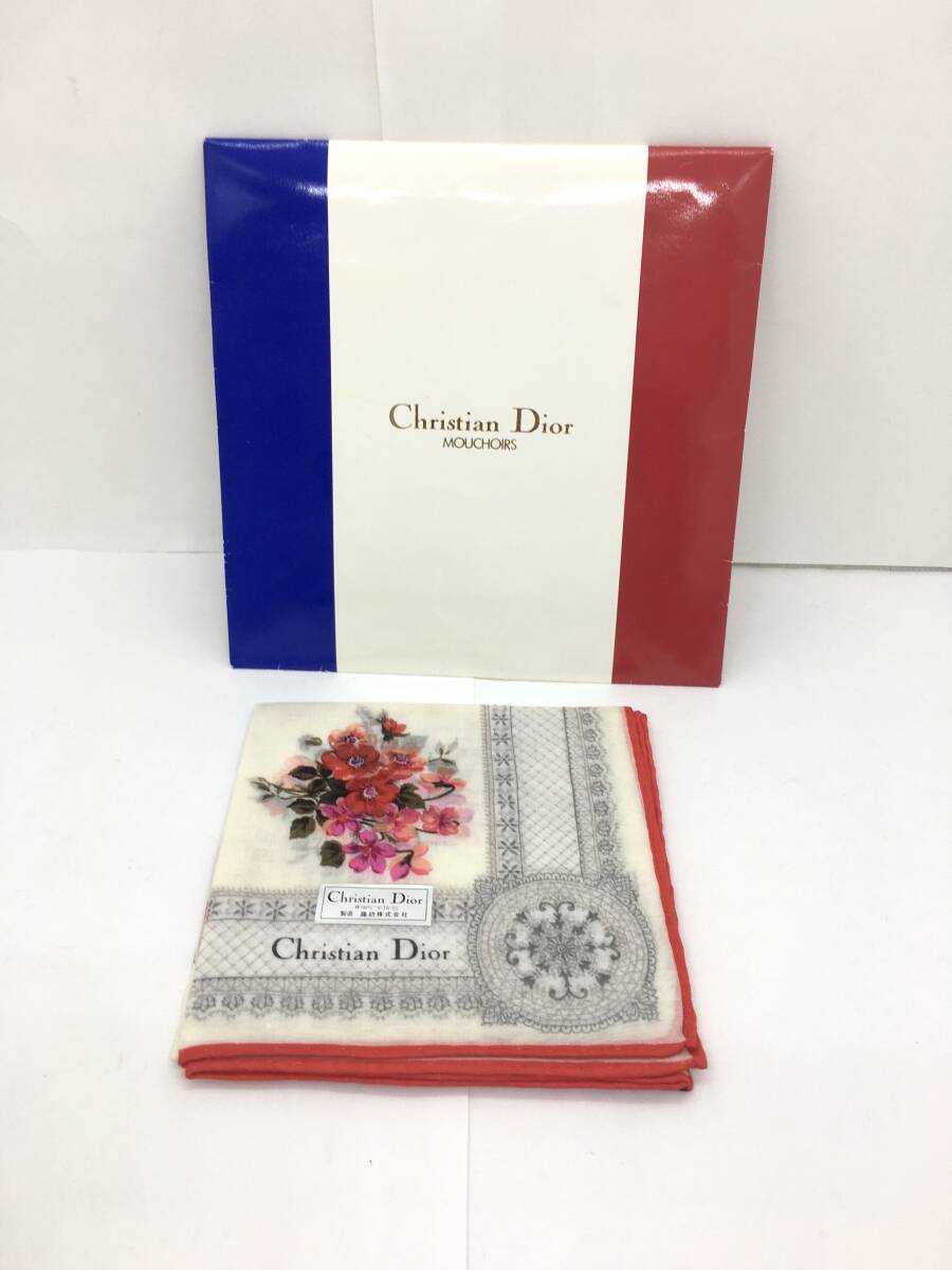 - 【未使用保管品】Christian Dior クリスチャンディオール ハンカチ 花柄 赤系×白 昭和レトロ