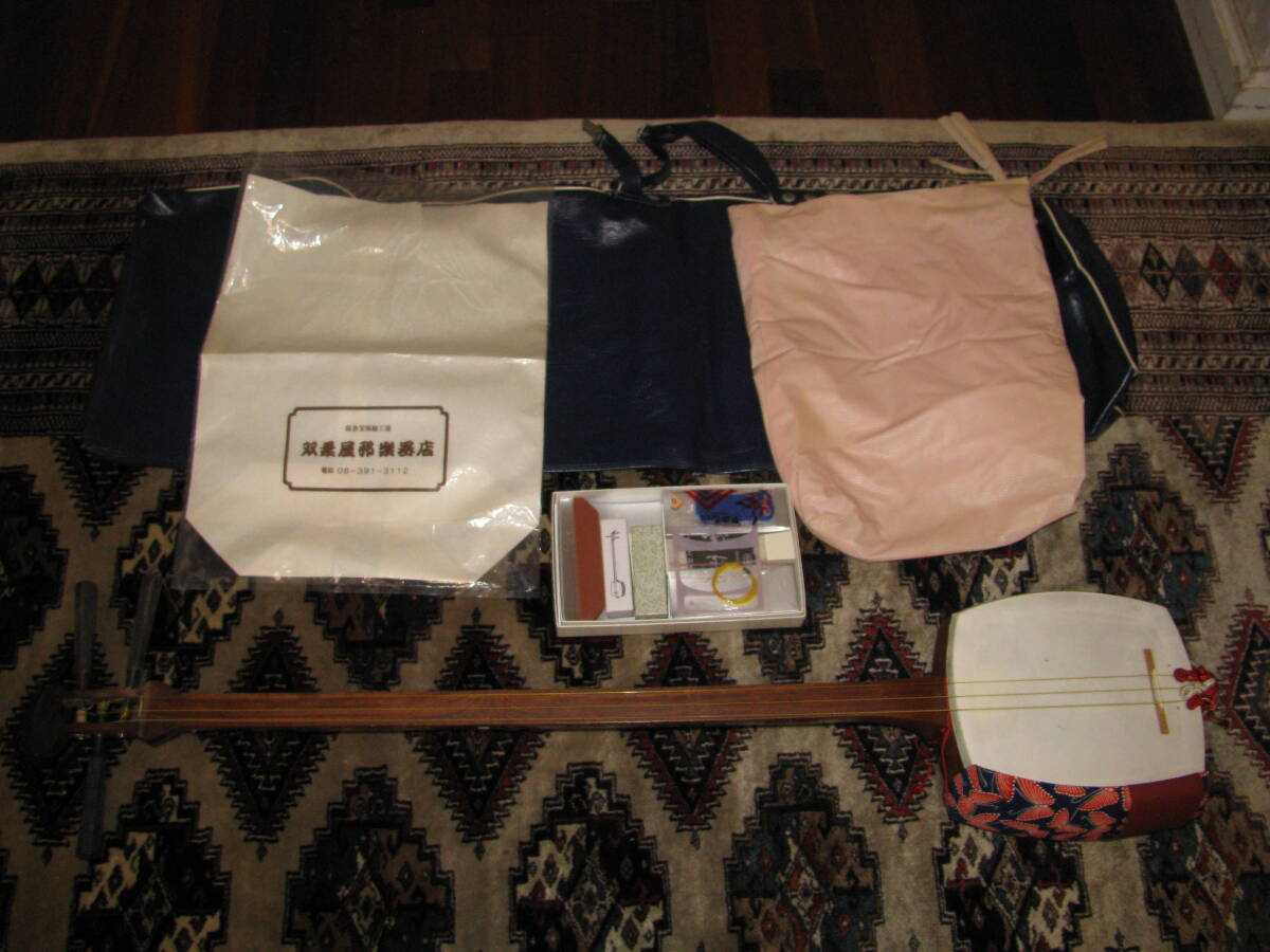 - 詳細不明 三味線一式 ソフトケース、バチ、駒、胴掛け、ゴムなど一式付き 中古