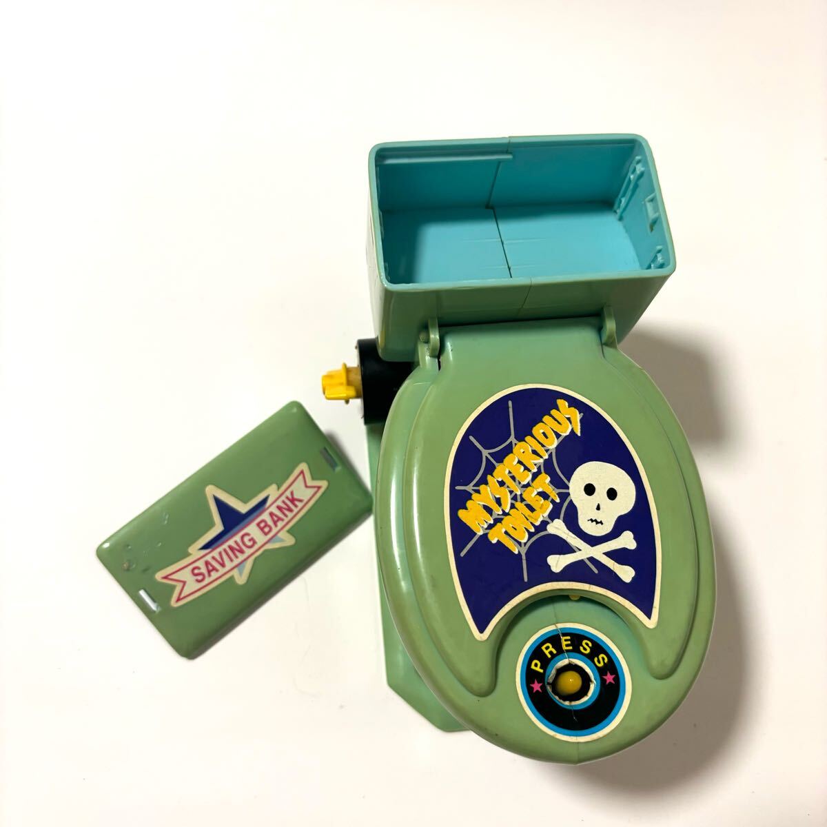 - トイレ型カラクリ貯金箱 水色 ドクロ オモチャ 置物 オブジェ 平成レトロ