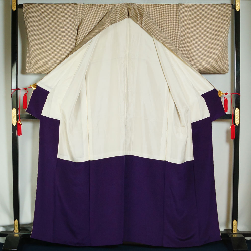 > 小紋 染め匹田模様 生成り色・本紫色系 綸子 裄長・Lサイズ 中古 リサイクル小紋 リサイクル 着物 女性和服 着物 京都きもの天陽