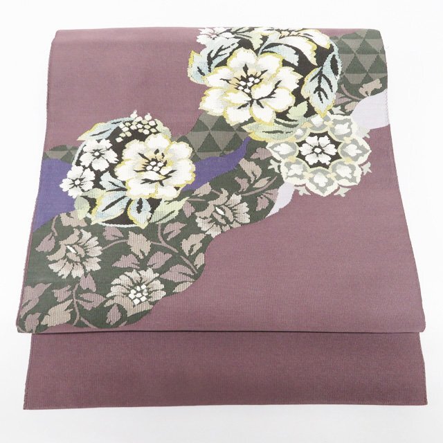 > 名古屋帯 なごや帯 中古 リサイクル 正絹 カジュアル 仕立て上がり 綴れ織 花の図 箔色 きもの北條 A1243-3