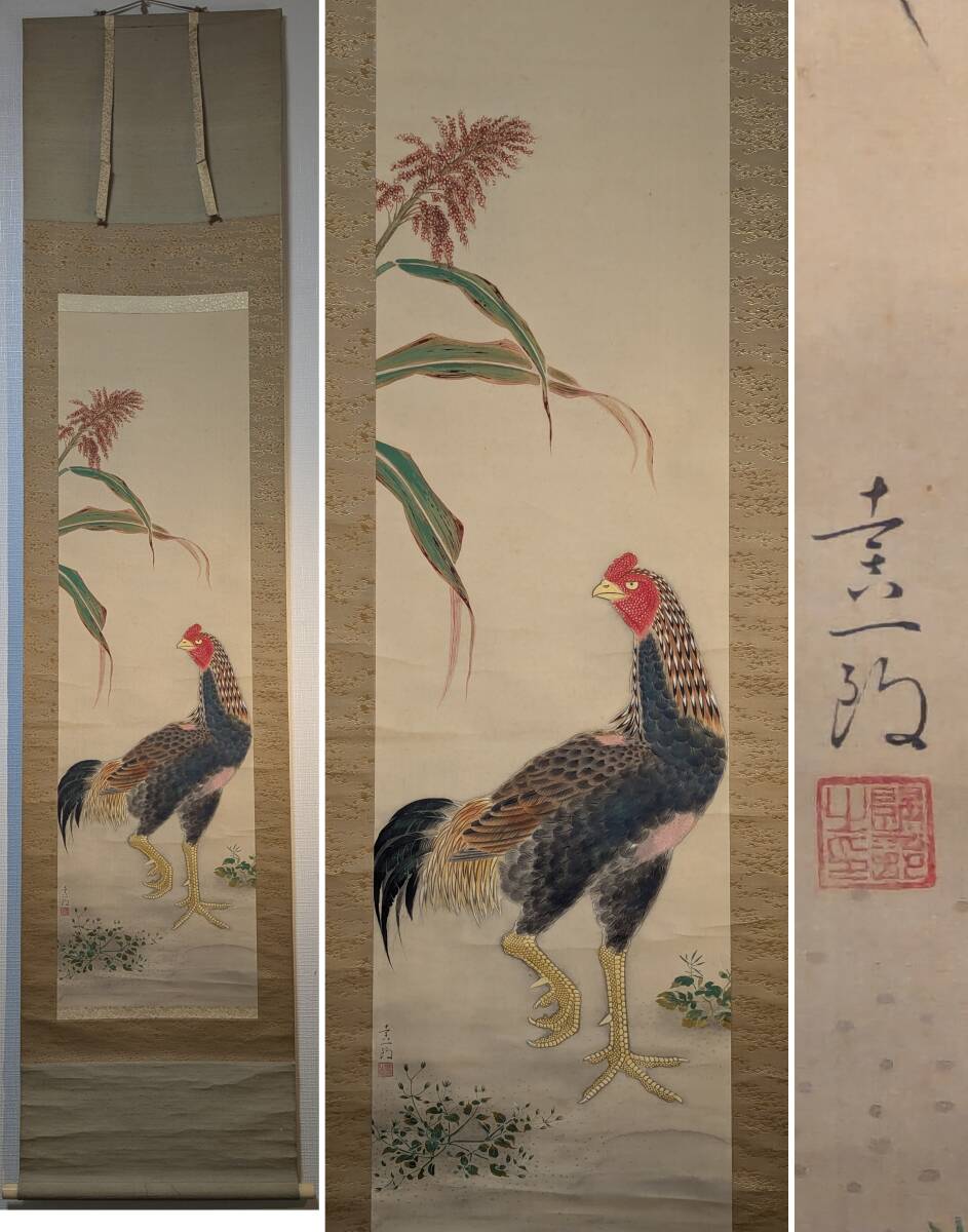 - 【真作】掛軸 軍鶏図 細密彩色花鳥画 秋の風趣 写実花鳥画 合箱入 T108
