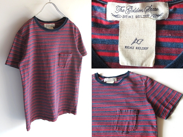 > REMI RELIEF レミレリーフ ウォッシュ加工 コットン ボーダー ポケットTシャツ L インディゴ レッド 藍 赤 ビームス取扱ブランド ネコポス