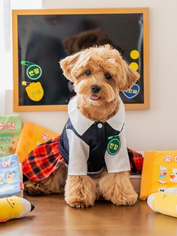 - ペット ワンちゃん用 シャツベスト付チェック柄制服ワンピース 犬用 Mサイズ