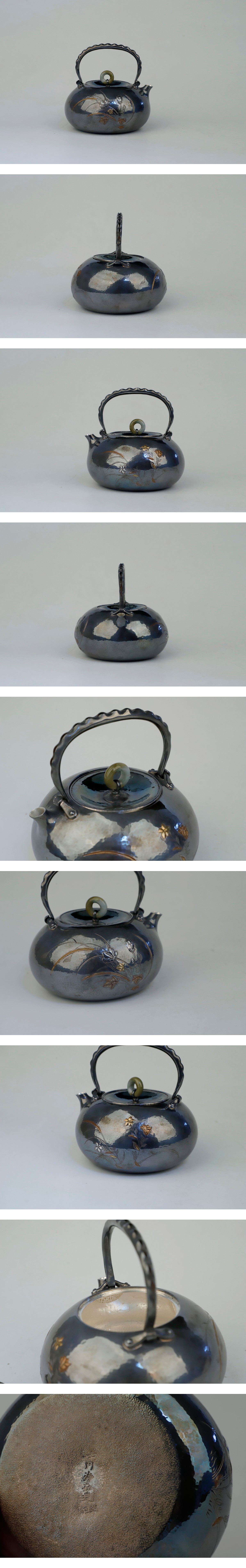 - 純銀保証 中川浄益造 玉摘み 草花象嵌彫金 平丸形 湯沸 銀瓶 時代物 美術品 煎茶道具