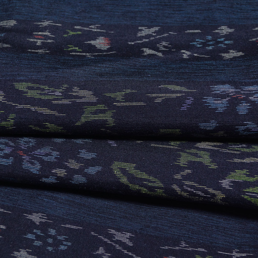 > 紬 横段に植物模様 裄長・Lサイズ 濃藍色系 中古 リサイクル着物 正絹 京都きもの天陽