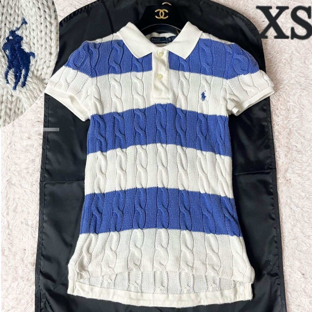 > POLO by RALPH LAUREN ポロバイラルフローレン ケーブルニット ポロニット 半袖 ワンポイント刺繍 ホワイト ブルー ボーダー ロゴ XS