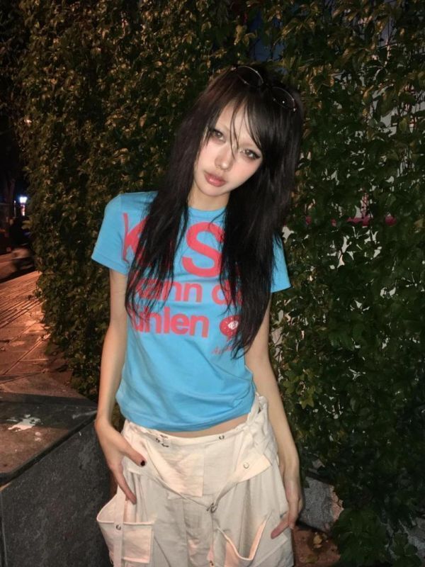 > Tシャツ Y2K グランジ チビT ピチT ロゴ ショート丈 タイト カットソー トップス 半袖 レディース M 夏 おしゃれ ブルー 英字プリント 新品