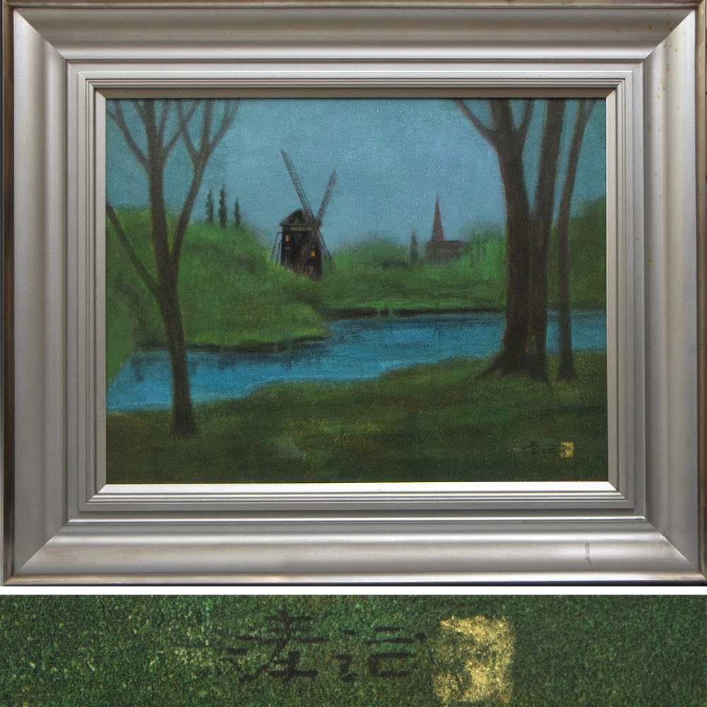 > 【真作】 秋元清治 紙本着彩 10号「風車のある風景」 署名落款有 共シール 岩彩 額装 黄袋 箱 日本画 絵画 アート インテリア  u0666a