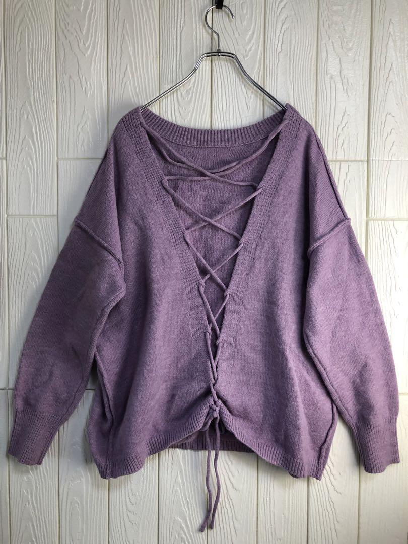 - レースアップパープルニット 38cm肩幅 54cm着丈 オーバーサイズ Fサイズ
