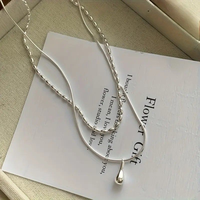- 上品 シルバー ティアドロップ ダブルレイヤーネックレス|レディース シンプル 重ね付け風 ペンダント アクセサリー ネックレス