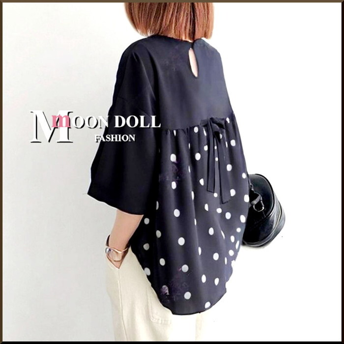 - ■~3L4L5L*バックドット切替涙開きホール+りぼん付ブラウス*黒