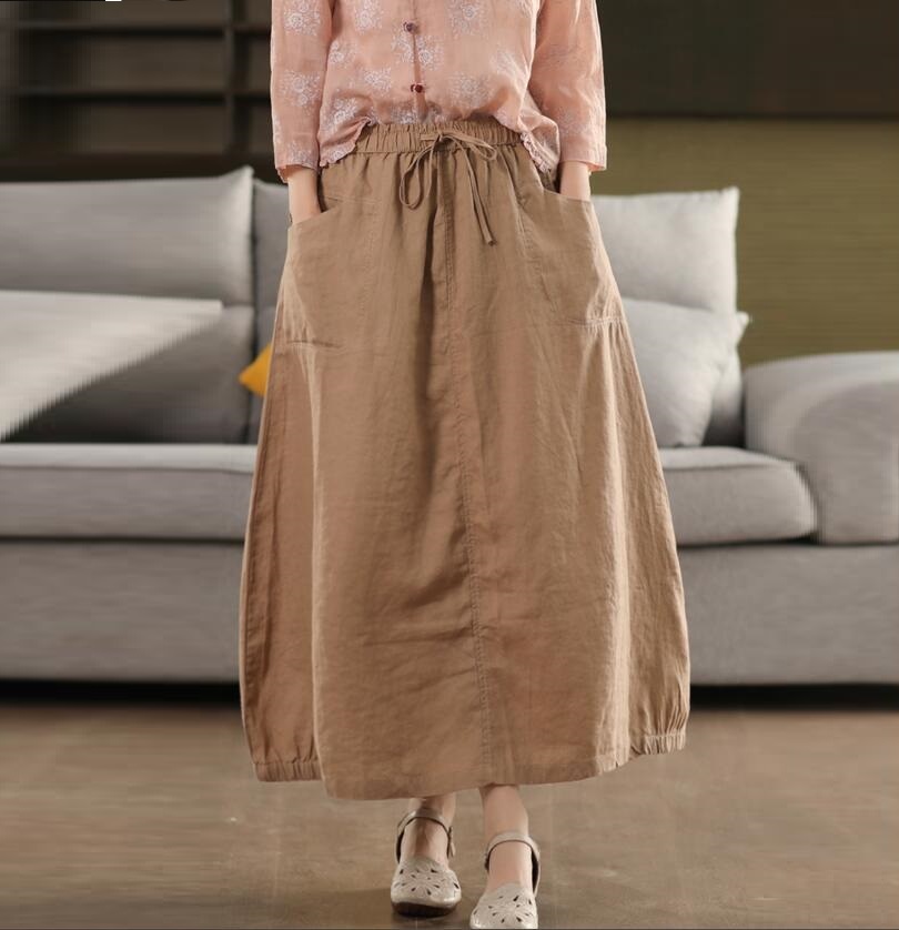 - 新入荷*レディース フレアスカート ロングスカート ボトムス ウエストゴム 着痩せ 美脚 通勤 きれいめ Aライン リネンスカート*カーキ