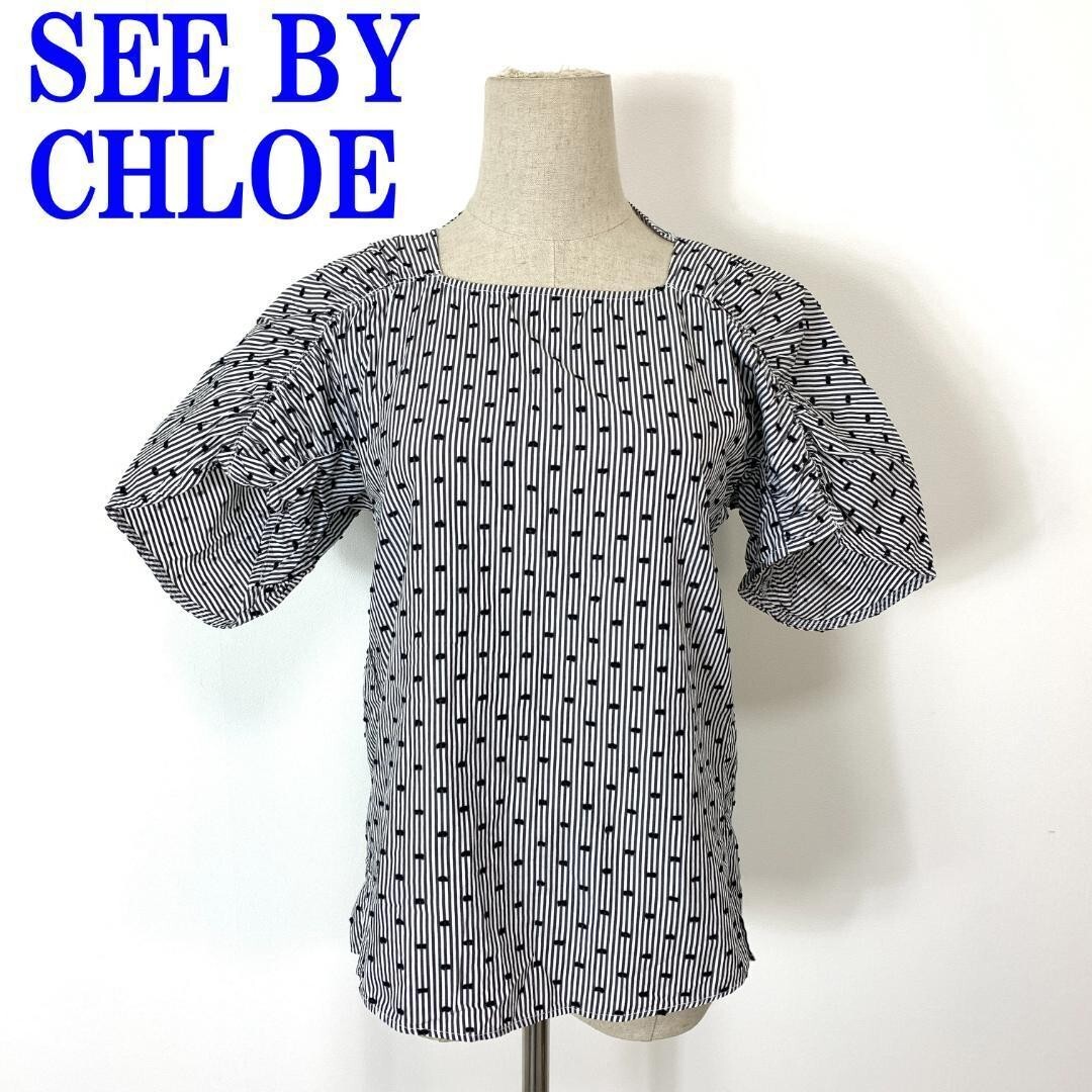 - シーバイクロエ 半袖ブラウス シャツ 黒 白 SEE BY CHLOE ストライプ ドットパフスリーブ ブラック ホワイトコットン100% 36 C3376