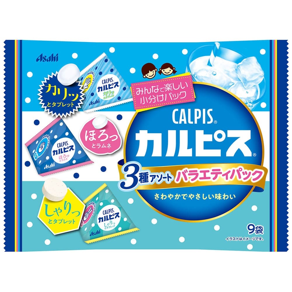 ▼▼▼▼▼▼注意事項▼▼▼▼▼▼・送料込み(送料700円が商品価格に含まれています) 一部地域では追加送料あり。・お取り寄せ商品です。弊社にて手配後、メーカー・卸業者からの直送になります。・まれにメーカー欠品、出荷遅延等が発生致します。問題発生時は別途メールにてご連絡致します。・配送方法の指定、日時指定、置き配、ギフト対応、他商品との同梱配送などは対応できません。・まとめ買いや複数購入の場合は通常より発送に時間が掛かる場合がございます・複数個口の場合、2階以上への搬入ができない場合があります。(その場合は1階での受け渡しとなります)・大型連休、お盆、年末年始などは発送をお休みさせていただく場合がございます・メーカー都合により、パッケージは予告なく変更される場合がございます・梱包用のダンボールはリサイクル品を使用させていただきます。・注文に関するご連絡(注文確定通知・発送通知など)はメールでご案内させていただきます※商品ページの内容について、少しでもご不明な点などがございましたら購入前に一度ご連絡ください▲▲▲▲▲▲注意事項▲▲▲▲▲▲〇商品説明3つの食感(カリッと・ほろっと・しゃりっと)のカルピスを味わえるバラエティパックです。タブレット2種とラムネ1種の3種アソートです。●小分けに便利な小袋包装で、周りの人とシェアして楽しめます。【品名】菓子【原材料】★カリっとタブレット砂糖(国内製造)、殺菌乳酸菌飲料(乳成分を含む)、水飴/ショ糖エステル、酸味料、甘味料(ソルビトール)、香料★ほろっとラムネ含水結晶ぶどう糖(国内製造)、でん粉、殺菌乳酸菌飲料(乳成分を含む)/ショ糖エステル、甘味料(ソルビトール、スクラロース)、酸味料、香料★しゃりっとタブレット砂糖(国内製造)、殺菌乳酸菌飲料(乳成分を含む)、水飴/甘味料(ソルビトール、キシリトール、アセスルファムK)、酸味料、ショ糖エステル、香料【栄養成分】★カリっとタブレット(1袋7.5g当たり)エネルギー:32kcaLたんぱく質:0g脂質:0.05〜0.6g炭水化物:7.3g食塩相当量:0g★ほろっとラムネ(1袋7g当たり)エネルギー:28kcaLたんぱく質:0g脂質:0.05〜0.5g炭水化物:6.3g食塩相当量:0g★しゃりっとタブレット(1袋7.2g当たり)エネルギー:30kcaLたんぱく質:0g脂質:0.03〜0.4g炭水化物:7.1g食塩相当量:0g【保存方法】・直射日光・高温多湿を避け、常温で保存してください。【注意】・ご年配の方や小さなお子様がお召し上がりになる際は、のどに詰まらせないようにご注意ください。・外装を開封後はお早めにお召し上がりください。・しゃりっとタブレットはしゃりっと食感を出すため、ザラメ等を入れており表面が欠けやすくなっておりますが品質上問題ありません。〇商品仕様個装サイズ:240X180X45mm個装重量:約80g内容量:67g(個装紙込み)製造国:日本【発売元:アサヒグループ食品株式会社】(出典:アサヒグループ食品)