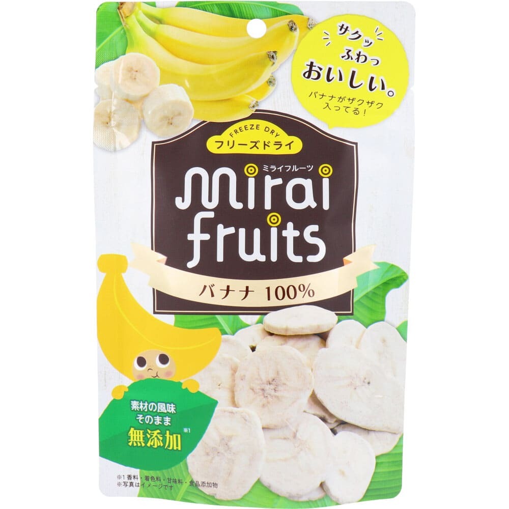 ▼▼▼▼▼▼注意事項▼▼▼▼▼▼・送料込み(送料700円が商品価格に含まれています) 一部地域では追加送料あり。・お取り寄せ商品です。弊社にて手配後、メーカー・卸業者からの直送になります。・まれにメーカー欠品、出荷遅延等が発生致します。問題発生時は別途メールにてご連絡致します。・配送方法の指定、日時指定、置き配、ギフト対応、他商品との同梱配送などは対応できません。・まとめ買いや複数購入の場合は通常より発送に時間が掛かる場合がございます・複数個口の場合、2階以上への搬入ができない場合があります。(その場合は1階での受け渡しとなります)・大型連休、お盆、年末年始などは発送をお休みさせていただく場合がございます・メーカー都合により、パッケージは予告なく変更される場合がございます・梱包用のダンボールはリサイクル品を使用させていただきます。・注文に関するご連絡(注文確定通知・発送通知など)はメールでご案内させていただきます※商品ページの内容について、少しでもご不明な点などがございましたら購入前に一度ご連絡ください▲▲▲▲▲▲注意事項▲▲▲▲▲▲〇商品説明大地と太陽の恵みをギュッ!果実そのままの美味しさをいつでも手軽に。●ミライフルーツは果実100%で作ったフリーズドライフルーツです。●果実そのものの味を楽しんでほしい心を込めて果実だけでつくりました。砂糖・油・塩・保存料 不使用です。●優しい口当たりで、お子様からお年寄りまで安心してお召し上がりいただけます。●ドライなのにフレッシュ。驚きの美味しさと触感をお楽しみください。●果実に含まれている水分を凍らせ、そのままの状態で乾燥させて仕上げています。これにより、果実に含まれている食物繊維・栄養成分がそのまま残るため、生の果物をほぼそのままの形で残すことができるのです。 色、味、香りを損なわず素材そのものの美味しさをお楽しみいただけます。●ほぼ完全に水分を取り去っていますので長期保存ができ、素材の美味しさが長持ちします。●9ヶ月の赤ちゃんから食べられる「乳児用規格適用食品」です。乳児用規格適用食品とはお子さまに安心して与えることができるよう、一般的な食品より厳しい基準値を満たした商品の証明です。mirai fruit(ミライフルーツ)なら無添加なので、お子様にも安心して食べさせることができます。バックに入れておけば、おでかけ先でのオヤツにも最適!【名称】乾燥果実【原材料】バナナ【栄養成分(1袋12gあたり)】エネルギー・・・46kcaLタンパク質・・・1g脂質・・・0g炭水化物・・・11g -糖質・・・8g -糖類・・・8g食塩相当量・・・0g※推定値【月齢】9ヵ月頃から【ミライフルーツの美味しい楽しみ方】・ミライフルーツでステキなティータイムを。ミライフルーツは味だけでなく、見た目も可愛いからお客様へのおもてなしにピッタリ。お気に入りの器に盛りつけるだけで、素敵なティータイムを演出できます。・ミライフルーツを毎日の朝食にプラス。いつもの牛乳に、ヨーグルトに、シリアルに、さっとプラスするだけ!栄養価アップで健康的な一日のスタートをバックアップします!・ミライフルーツでお菓子作り。市販のホットケーキミックスにトッピングしたり、手作りのお菓子のアクセントとして使ってみましょう!アイデア次第でいつものおやつがワンランク上のスイーツに大変身!【保存方法】・直射日光・高温多湿の場所を避けてください。【注意】・本品製造工場では、卵、乳、小麦、えび、カニ、いか、牛肉、大豆、ゼラチン、鶏肉、豚肉、ごま、カシューナッツ、くるみ、さば、もも、りんご、バナナ、アーモンドを含む製品を製造しています。・果物をそのまま乾燥させているため、色・形・味に個人差があります。・表面に白い粉が付着していることがありますが、果物の糖分ですので安心してお召し上がり下さい。・果物の特性及び製造工程上、まれに表面に褐色や固い部分などが生じる場合がありますが、品質に問題はありません。・水分を吸収しやすい食品ですので、開封後はお早めにお召し上がりください。・初めて赤ちゃんに食べさせる時はアレルギーや消化不良などに気をつけながら少しずつ始めましょう。・繊維部分など、うまく飲み込めない時がありますので、様子を見ながら小さくしたり、水分を与えたりして必ず食べ終わるまで保護者が見守ってください。・横になっているときやおぶっているときなど、のどがつまりやすい姿勢では食べないでください。・アレルギーについてご確認の上、お召し上がりください。〇商品仕様個装サイズ:130X200X50mm個装重量:約24g内容量:12g原産国:ベトナム【発売元:株式会社ビタットジャパン】(出典:ピタットジャパン)