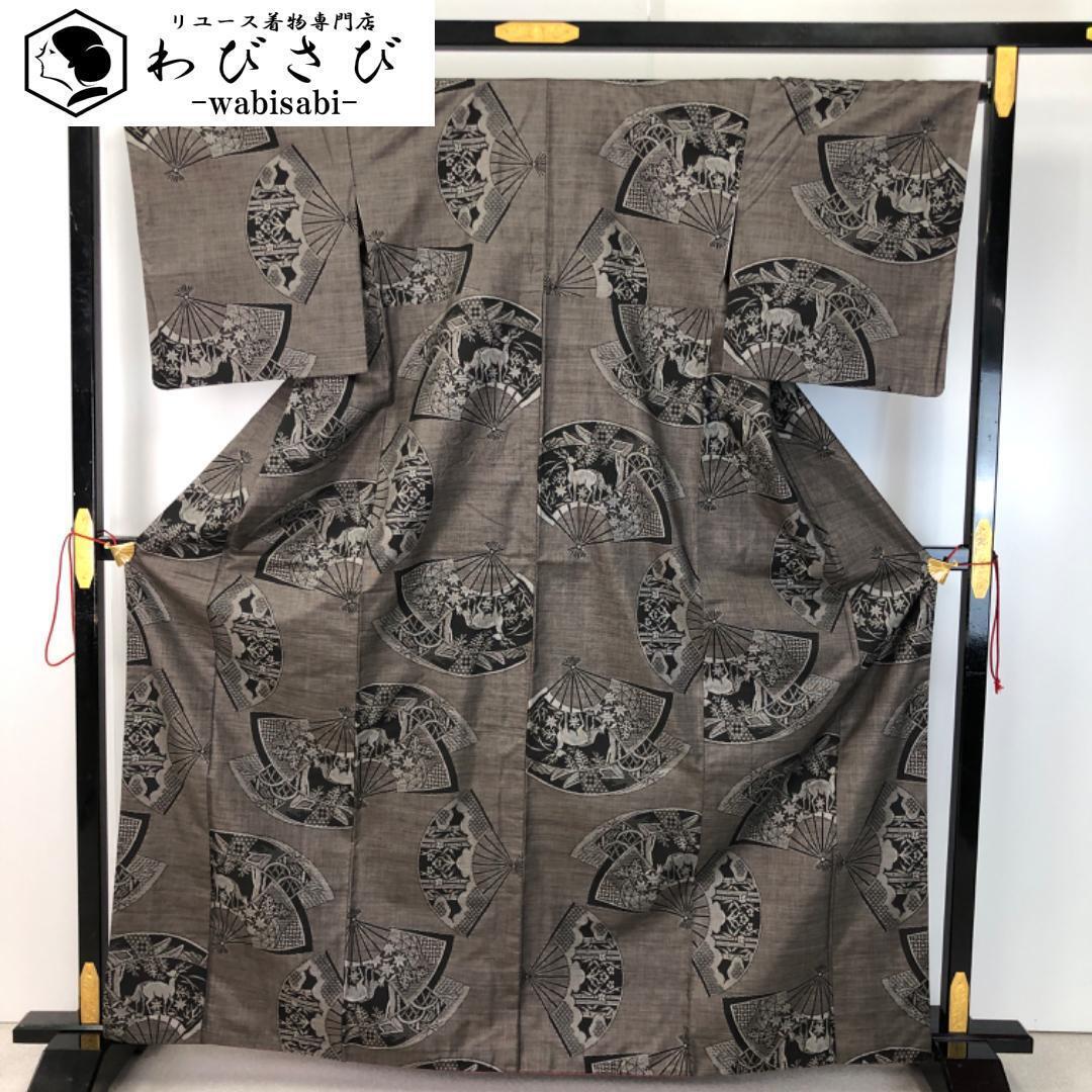 > 本場大島紬 恵大島紬. 扇子模様 茶泥染 カタス9マルキ 証紙付 K-4736