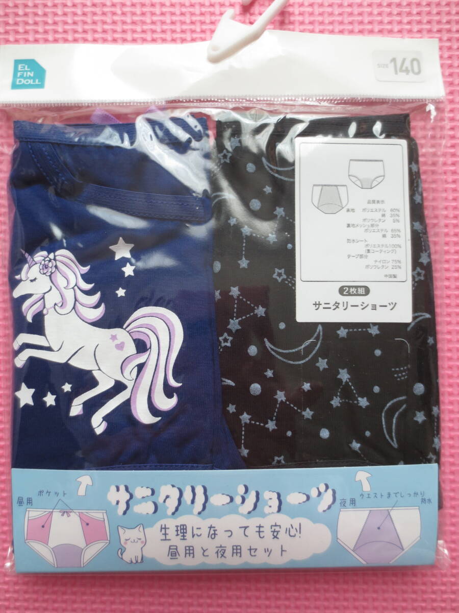 - 新品 140 2枚組 サニタリーショーツ ユニコーン 昼用夜用セット ポケット付き 羽つきナプキン対応 パンツ 女の子 生理用ショーツ 送料無料