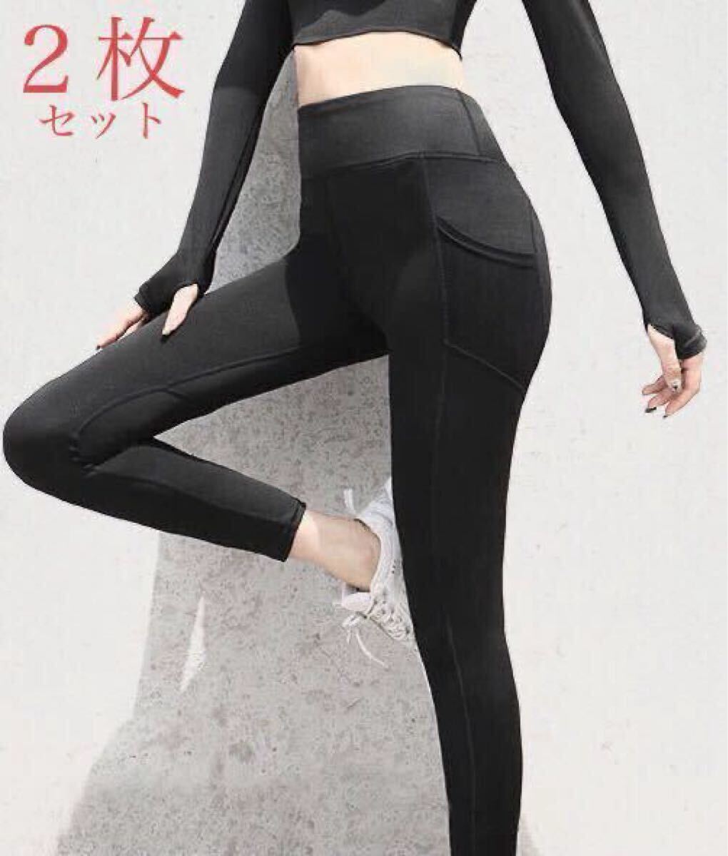 - 2枚組☆M高伸縮性スポーツレギンスパンツ ヨガ ランニングストレッチ着圧美足桃尻/ 黑