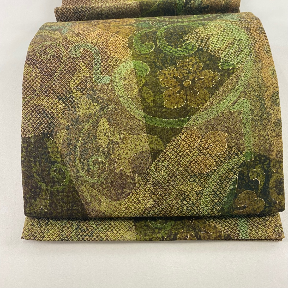 > 袋帯 美品 名品 花唐草 金彩 茶緑色 お太鼓柄 正絹 【中古】