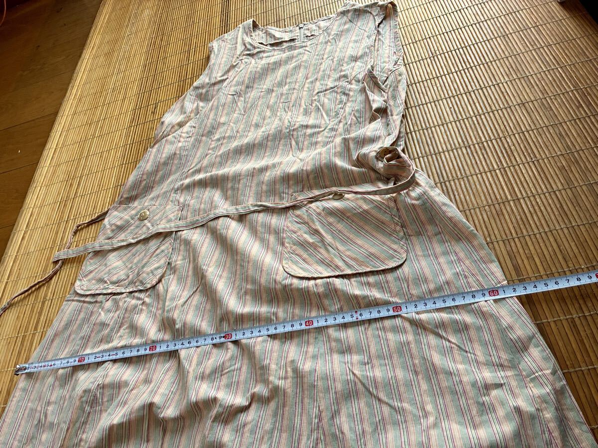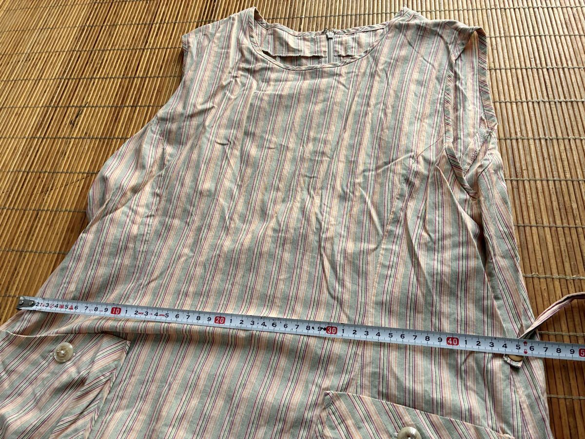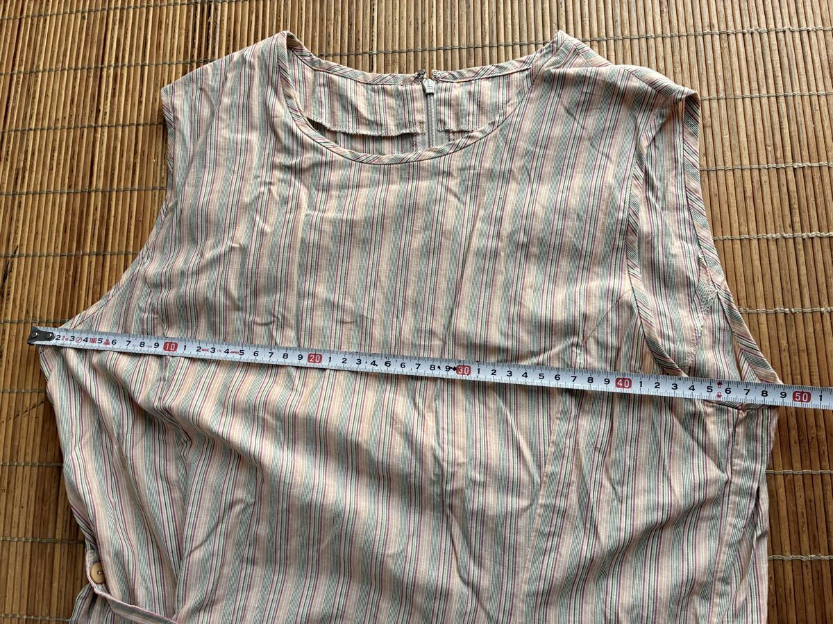 - ミセスノースリーブエプロン風アロングワンピース綿100%マルチカラーストライプL相当♪着丈およそ110cm膝丈