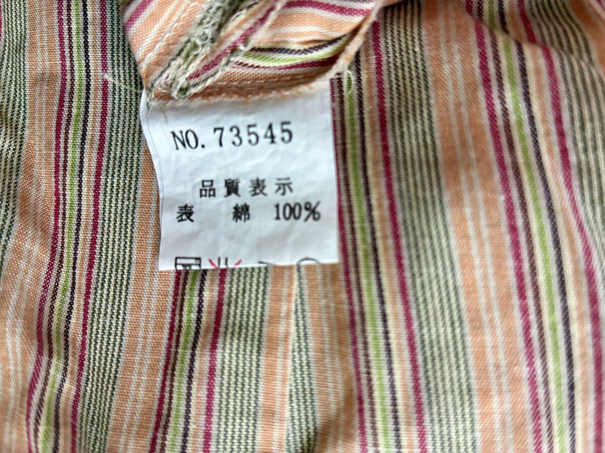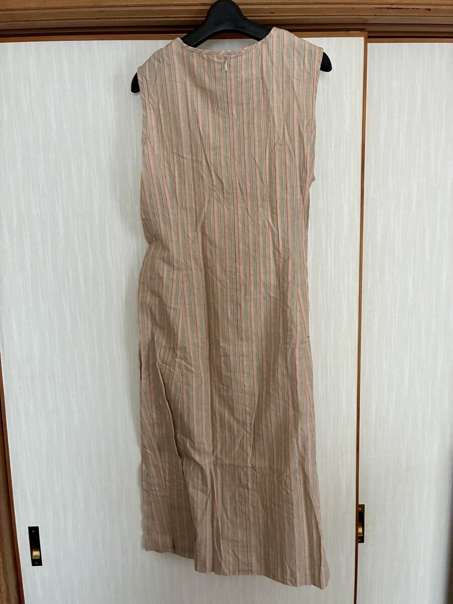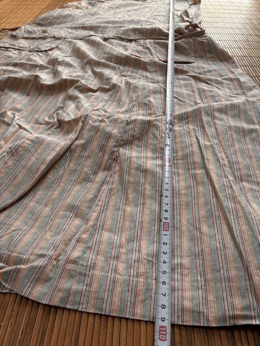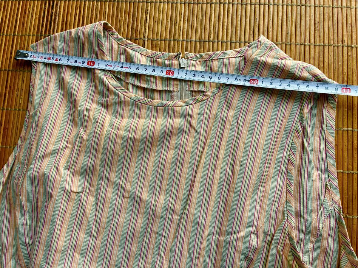 - ミセスノースリーブエプロン風アロングワンピース綿100%マルチカラーストライプL相当♪着丈およそ110cm膝丈