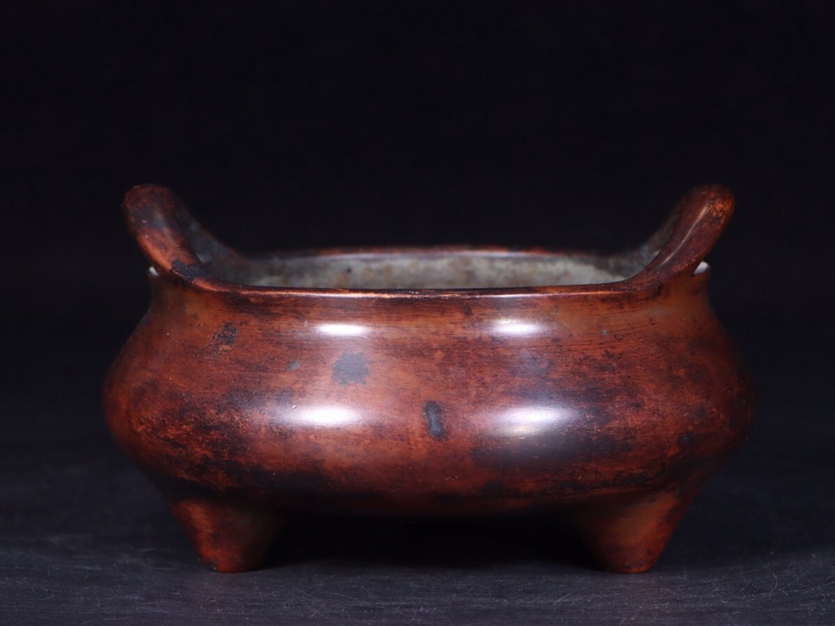 - 「明代 大明宣徳年製 古銅彫 三足橋耳老銅香炉」旧銅器 置物擺件 賞物 中国古美術 旧蔵出