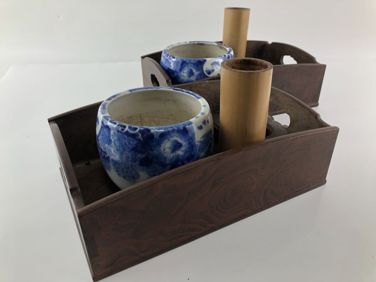 - ★煙草盆★染付 灰吹き 盆器台 灰皿 木製 現状 作者不明 昭和レトロ アンティーク 2点 まとめ★53★et2016