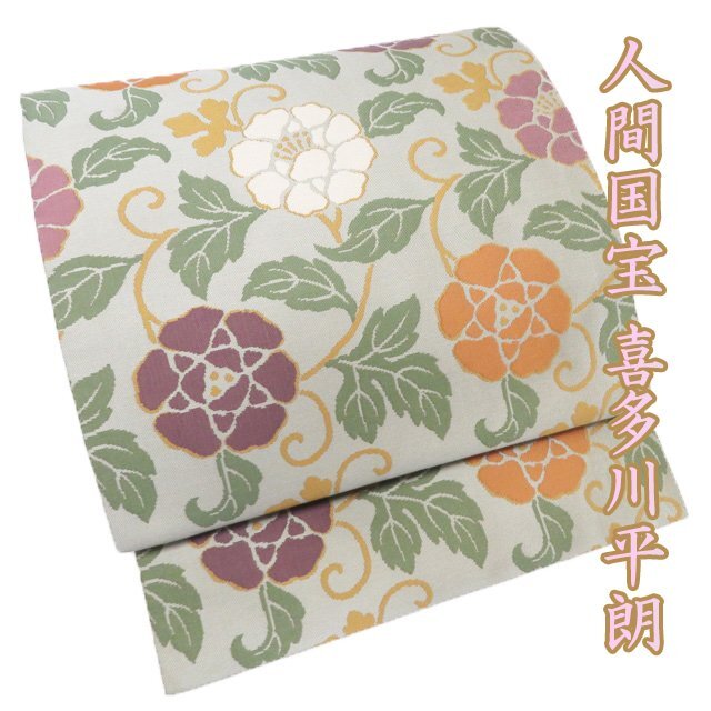 - 特選 開き名古屋帯 なごや帯 中古 リサイクル 正絹 カジュアル 人間国宝 喜多川平朗 牡丹唐草模様 裏葉色 多色 きもの北條 A1251-9