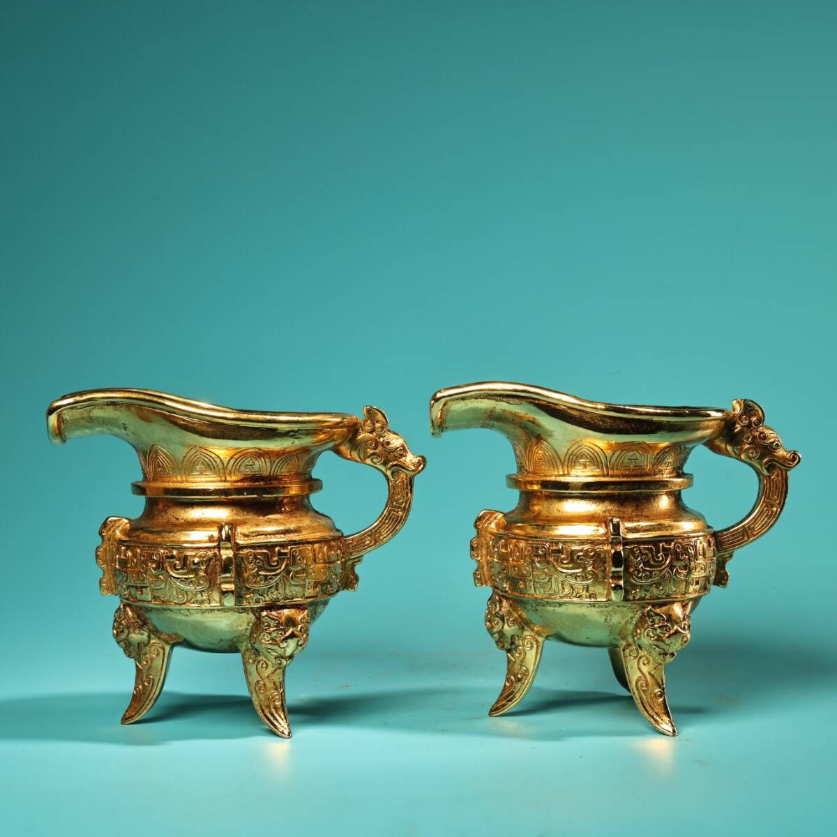 - ▽鴻▽ 銅製 塗金 獣面三足酒杯一對 置物 賞物 古賞物 古董品 時代物 稀少珍品 中国古玩 中国古美術