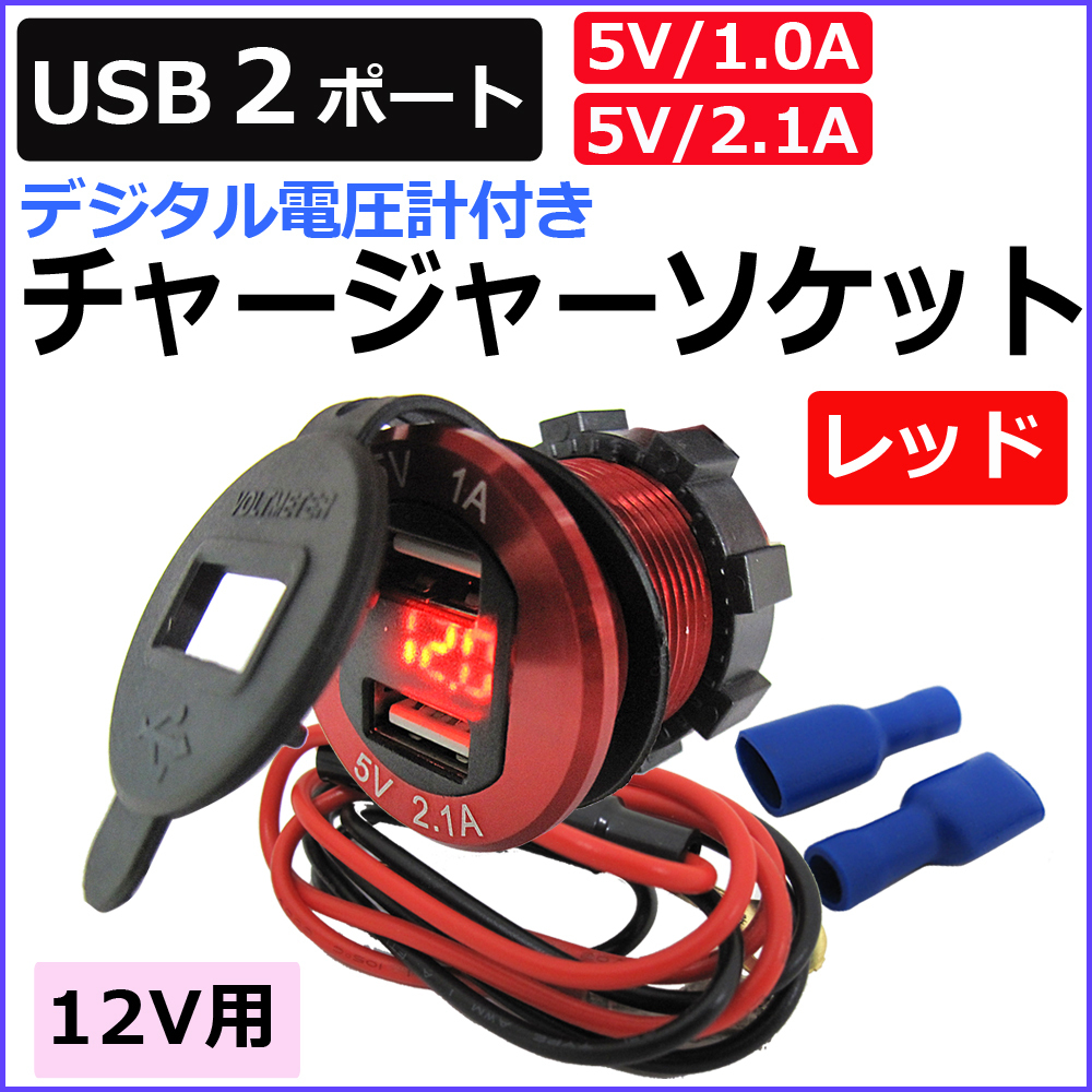 - 【互換品】ac463 汎用 デジタル電圧計付き USBチャージャー (2.1A+1.0Aタイプ)/レッド/USB2ポート/カバー付