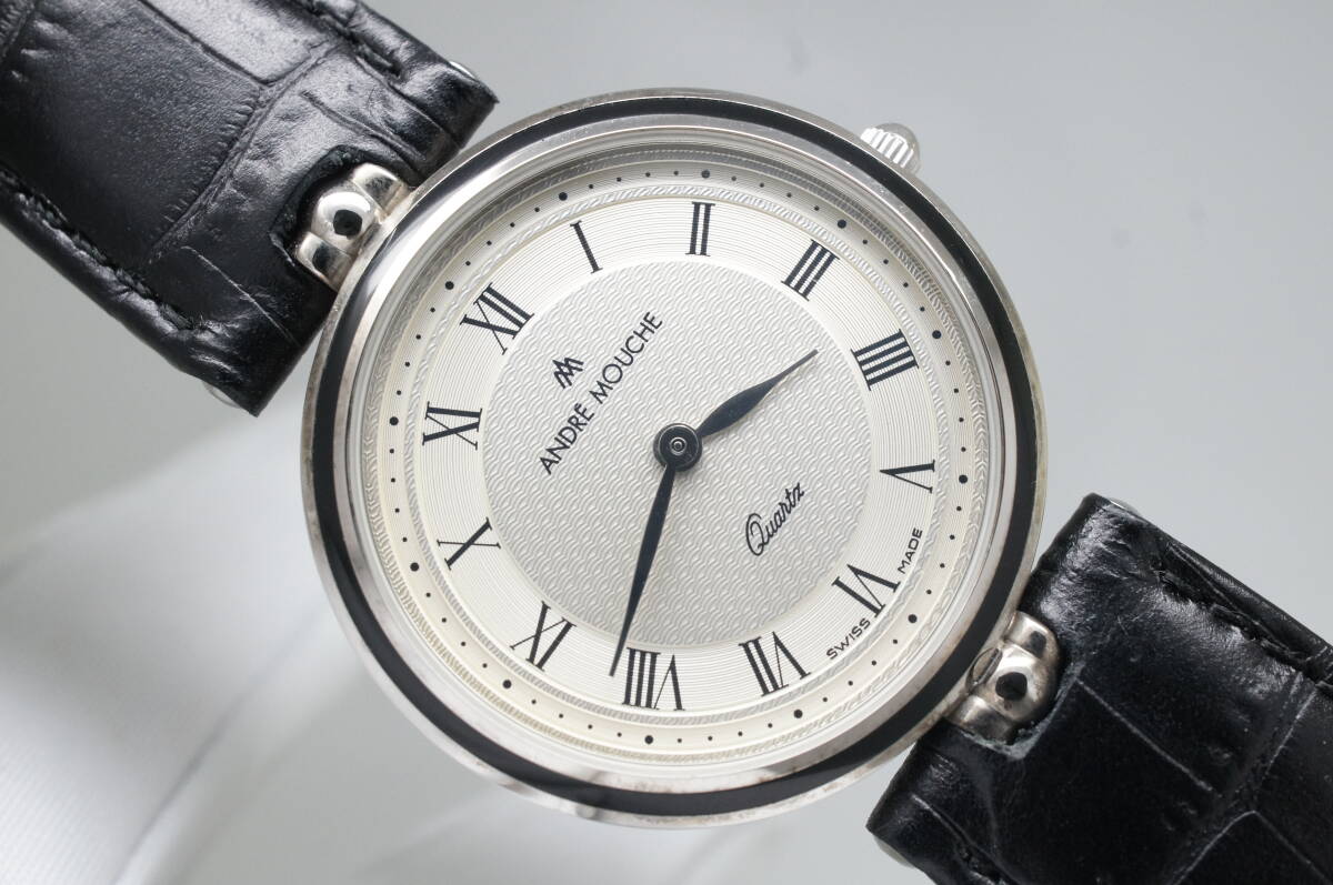 > H5●作動良好 美品 Andre Mouche アンドレムッシュ スイス製 全ローマン数字 メンズ腕時計 シルバー お洒落 クォーツ