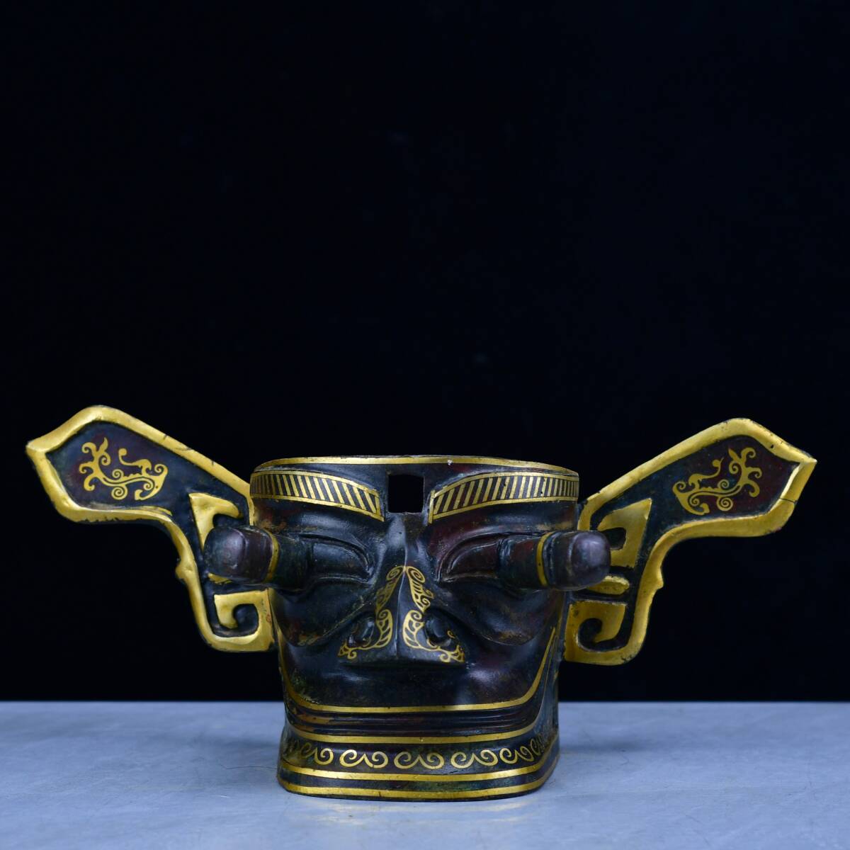 - 「珍館蔵品 戦国風 青銅器 古銅錯金彫 三星堆面具 置物 擺件」時代物 骨董 旧家蔵出し 唐物 中国古玩 華夏品 古美術品