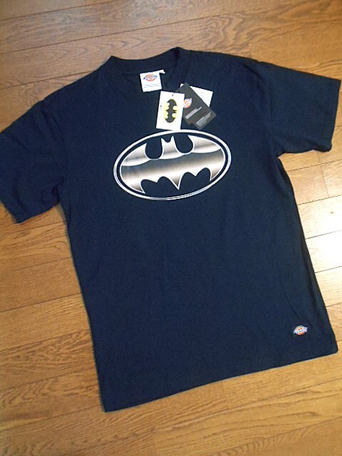 - Dickies・ディッキーズxバットマン☆綿100%♪フロントビッグプリントxロゴワッペン 半袖Tシャツ ネイビー 大き目 S 未使用品 定価¥5.500