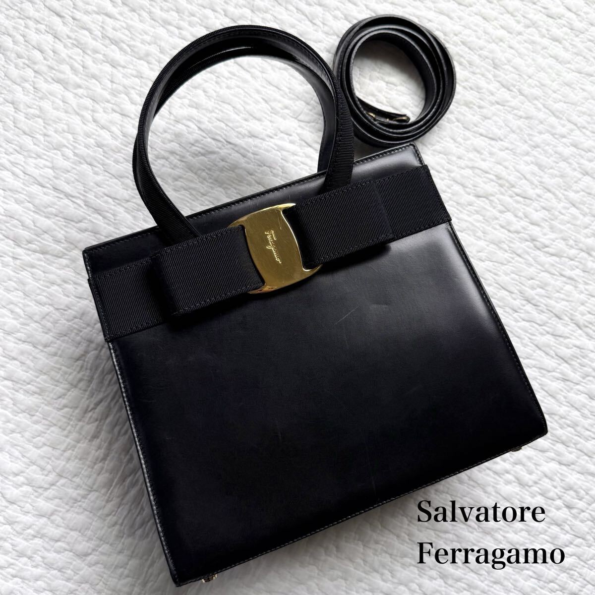 > 極美品 SalvatoreFerragamo サルヴァトーレフェラガモ 2way ショルダーバック ハンドバッグ ヴァラリボン ゴールド金具 レザー ブラック