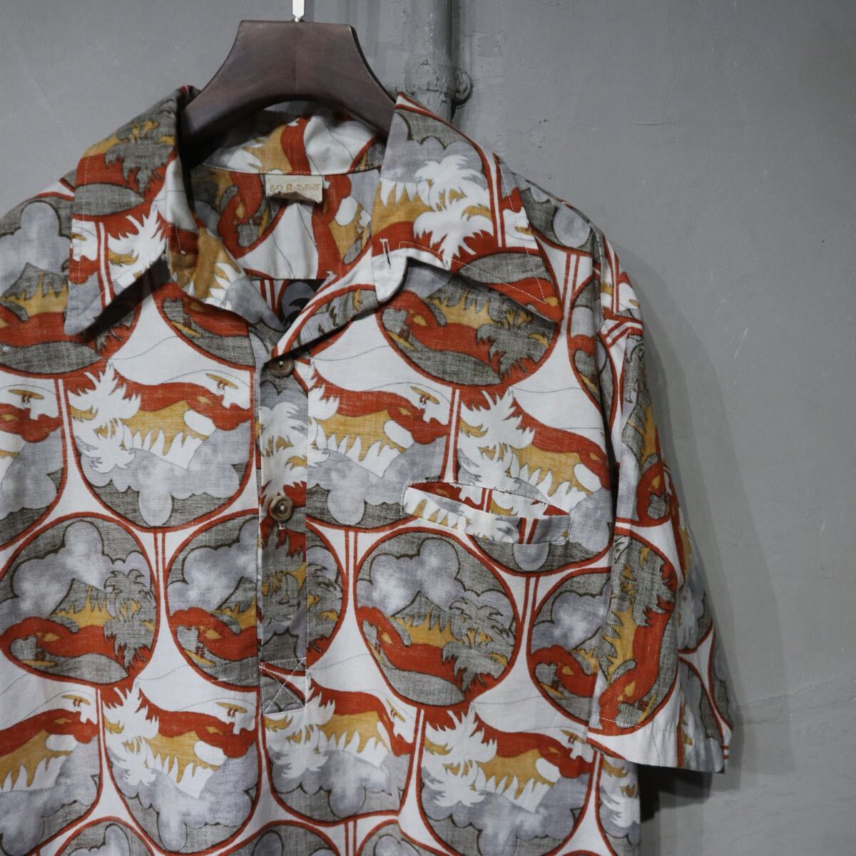 - 【即決】70s GO BaReFoot HAWAII プルオーバー ハワイアン アロハシャツ 総柄 オレンジ USA アメリカ ハワイ ヴィンテージ ビンテージ L