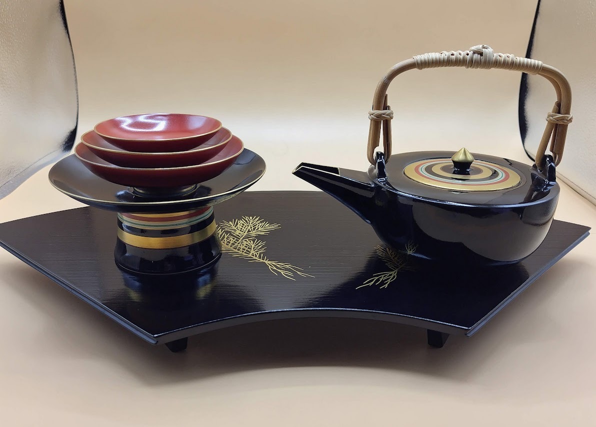 - お屠蘇セット 独楽柄銚子 三ッ組盃 根付き松枝柄扇面型屠蘇台 盃台