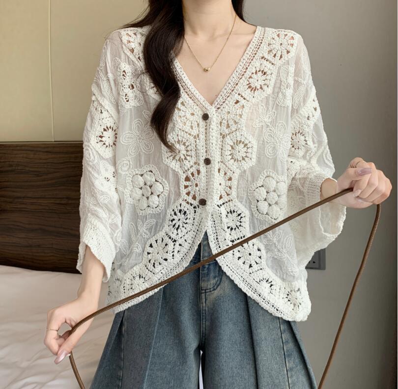> 新入荷* 夏 透かし編み カーディガン レディース 薄手 可愛い レース カーディガン 長袖 ドルマンスリーブ 羽織り UV 紫外線対策*白