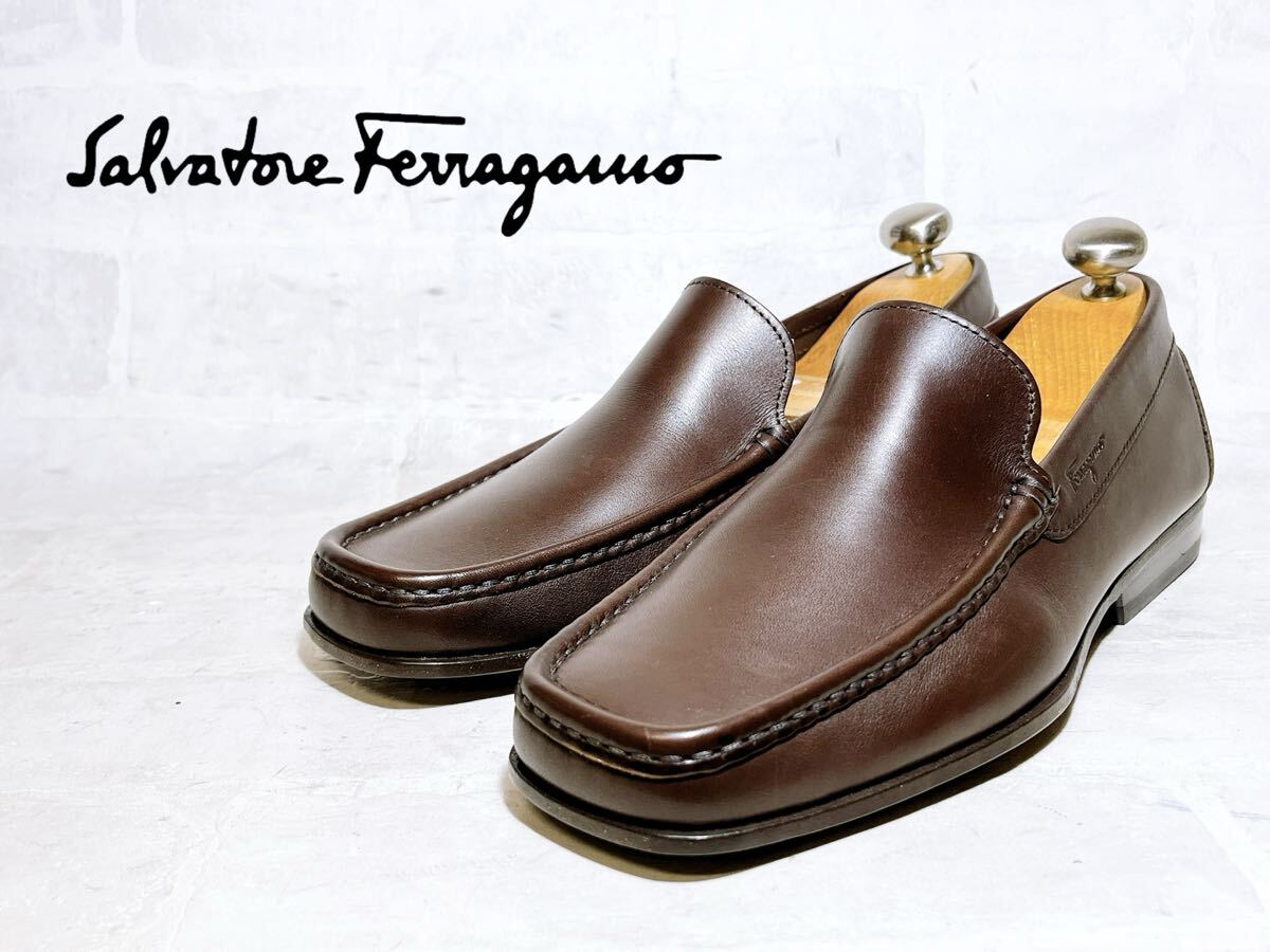 > イタリア製【未使用】サルヴァトーレフェラガモ 高級 ヴァンプローファー スリッポン 本革 レザー 茶 US6.5EE(約24.5cm)メンズ
