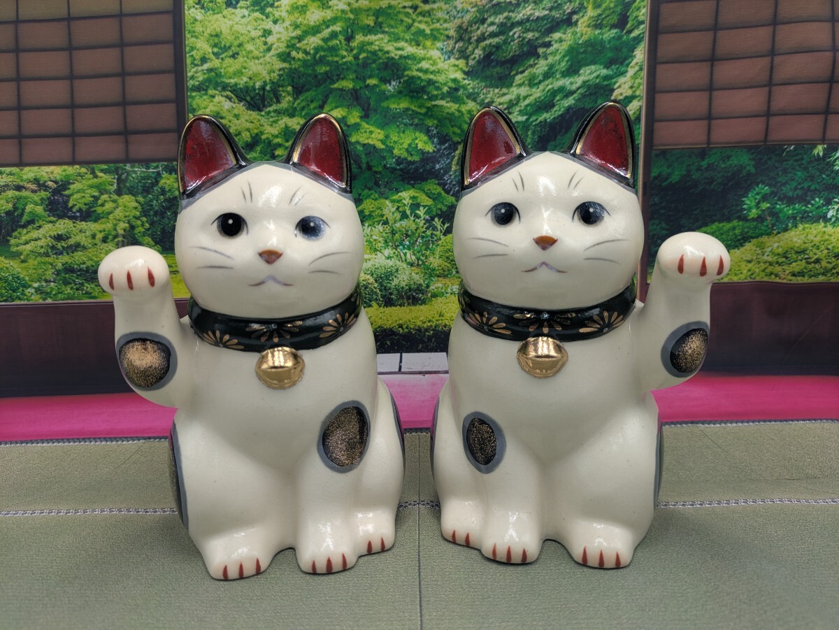 - 招き猫 陶彩菊花招き猫 緑右手上げ大 緑左手上げ大 2種セット 薬師窯