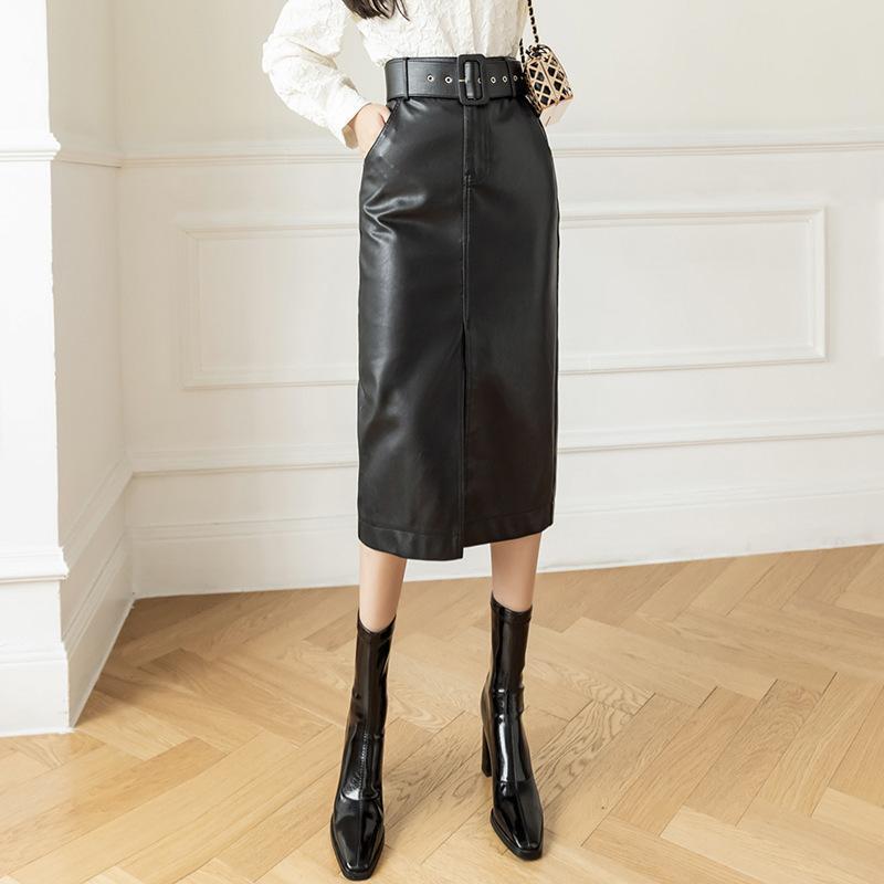 - フェイクレザー タイトスカート スタイリッシュ モード系 ブラック サイズM