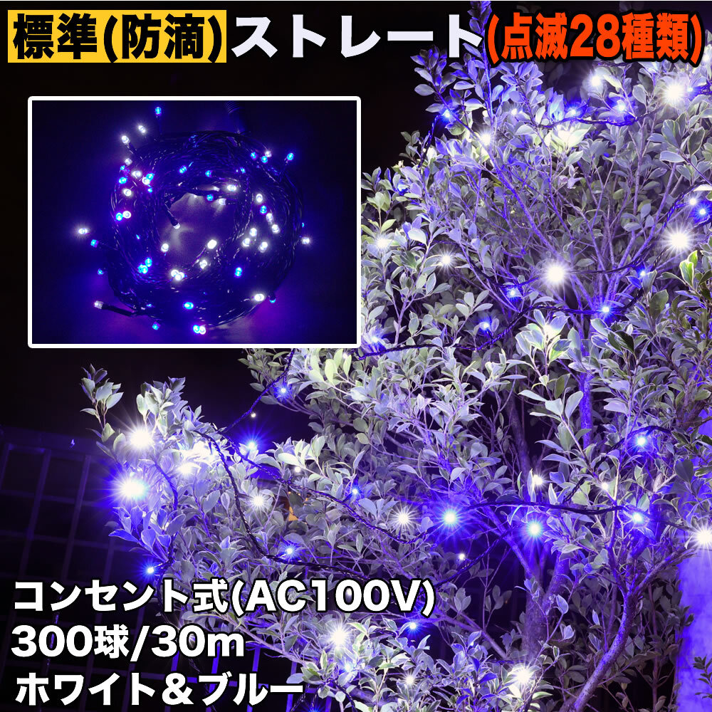 > クリスマス 防滴 イルミネーション ストレート ライト 電飾 LED 300球 30m 2色 白 ・ ブルー 28種点滅 Bコントローラセット