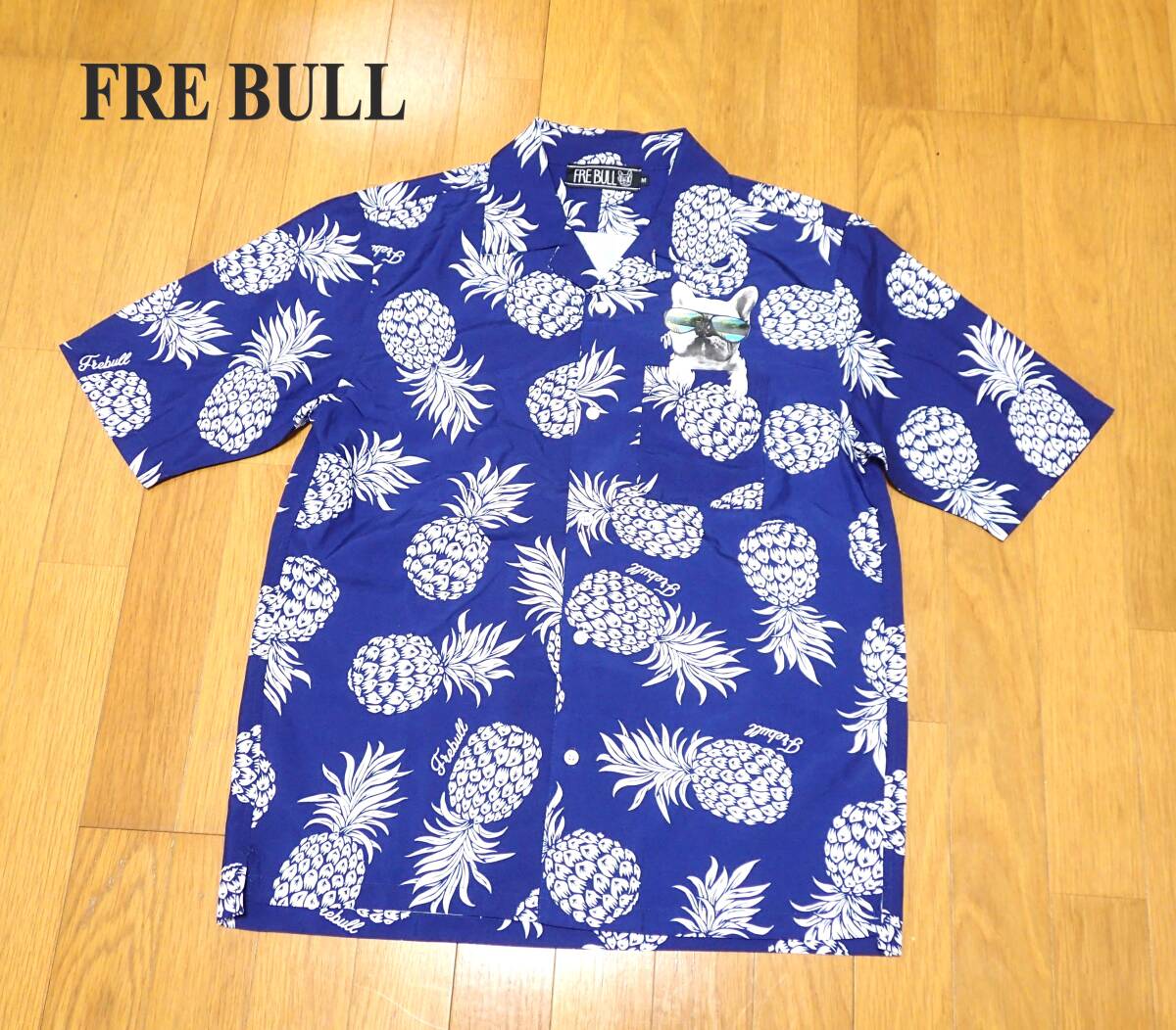 - ☆人気のパイナップル柄です ☆FRE BULL ☆トロピカル柄 ☆オープンカラー ☆アロハシャツ ☆ポリエステル ☆ネイビー ☆メンズ☆M