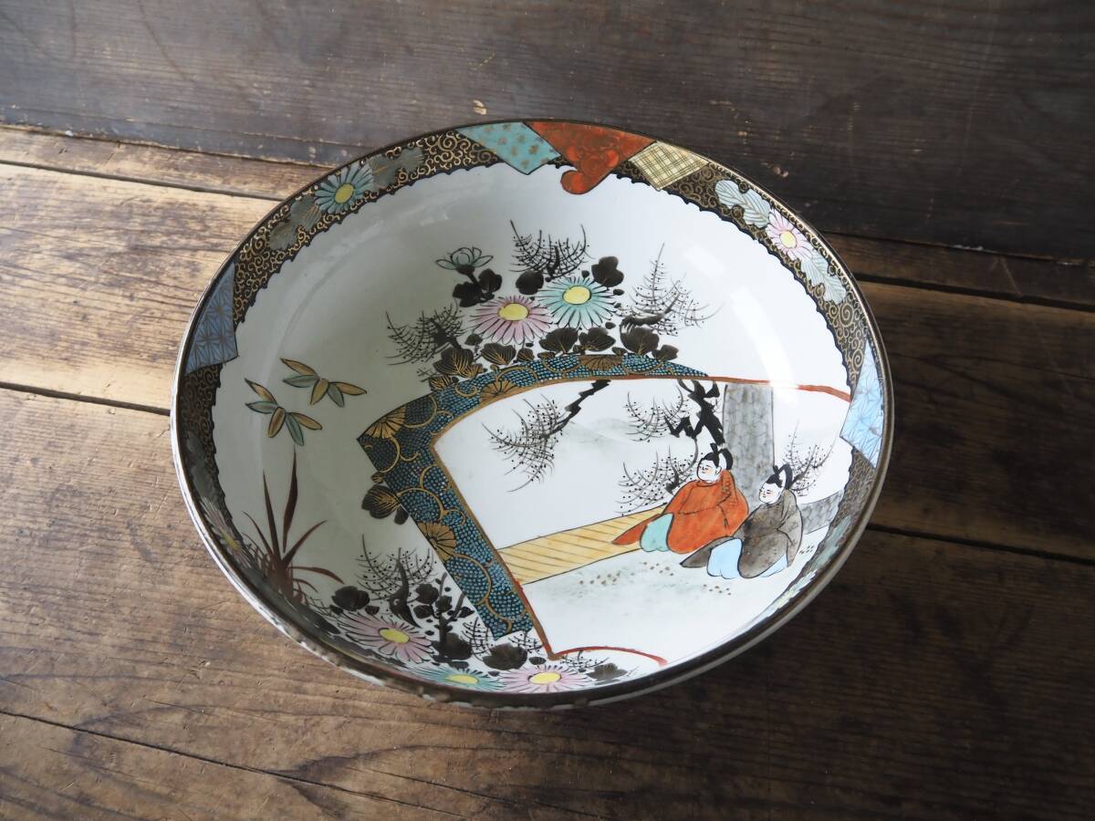 - 【OAN】 時代物 九谷焼 銘有 色絵 金彩 人物文 深鉢 大鉢 27.5cm 骨董 古美術 古道具 民藝 古民藝 茶道具 懐石 古玩 古九谷 青粒 在銘