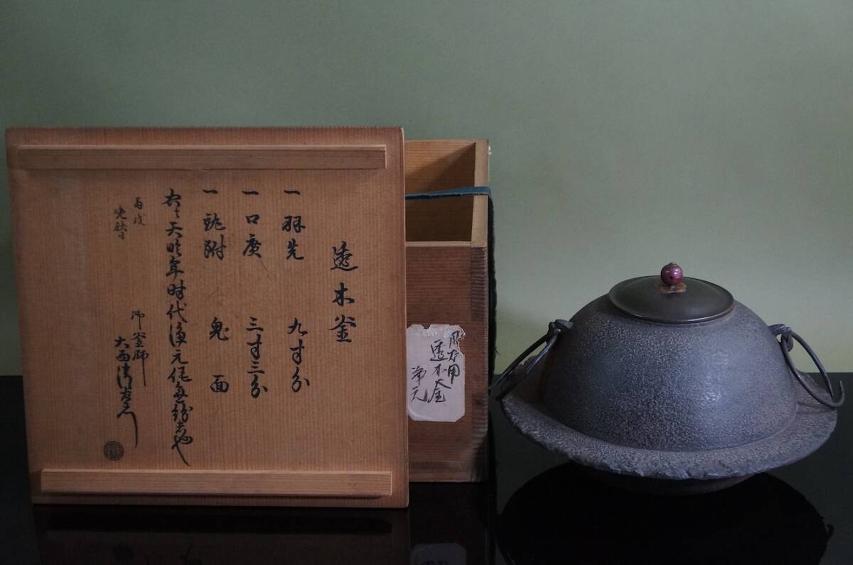 - ■ 和銑 透木釜「京都大西家九代 大西浄元作・14代大西清右衛門 浄中極め」(極め箱)釜鐶付き★ 茶釜 鉄釜 茶道具