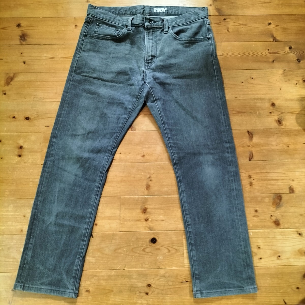 > 希少 絶版 先染め グレー スリムフィット ストレート ウエスト33(84cm) UNIQLO ユニクロ カイハラ セルビッチ 赤耳 UJ 055