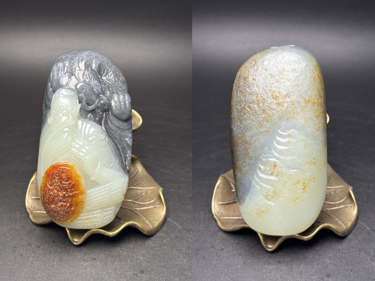 - 「時代物 和田玉 彫り 三色天然 関公 手把件」極細工 裝身具 賞物 中国古美術 旧蔵出