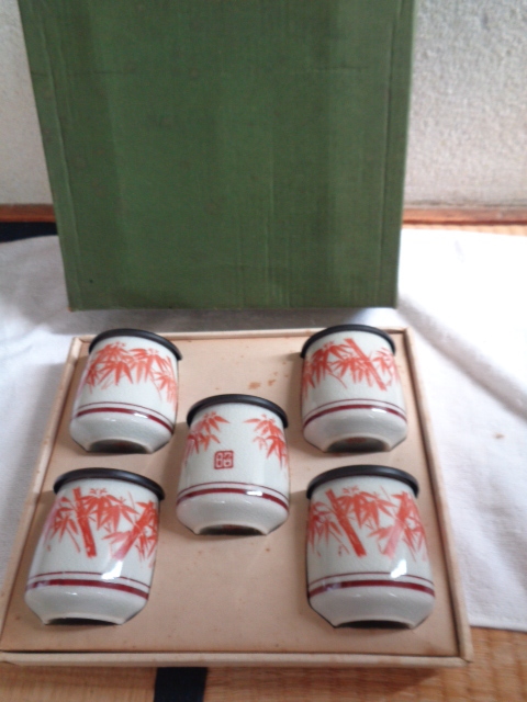 - 陶器 湯呑5客セット/湯呑本体&プラスチック蓋/窯不詳/箱入未使用品-長期保管品:多少シミ汚れ有り/